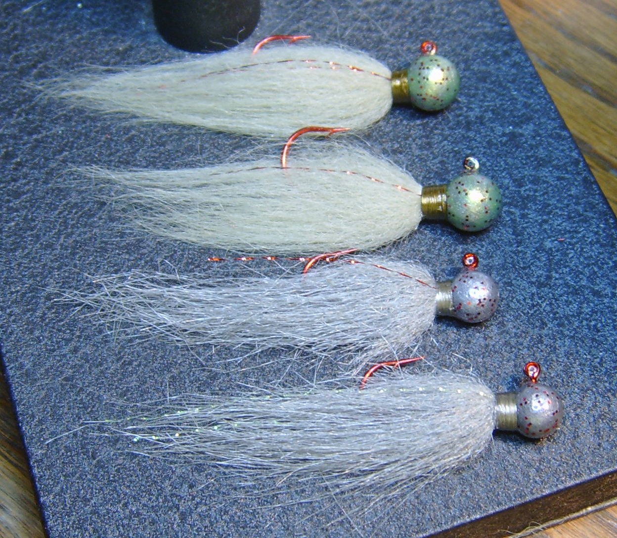 Three-sixteenths of an ounce on #1 hooks. I plan to trail a Baby Guido Bug behind the brown and orange ones and a Falls Minnow behind the black-n-gray. Actually, the black-n-gray jig weighs about 1/4 of an ounce and has a 1/0 hook.
